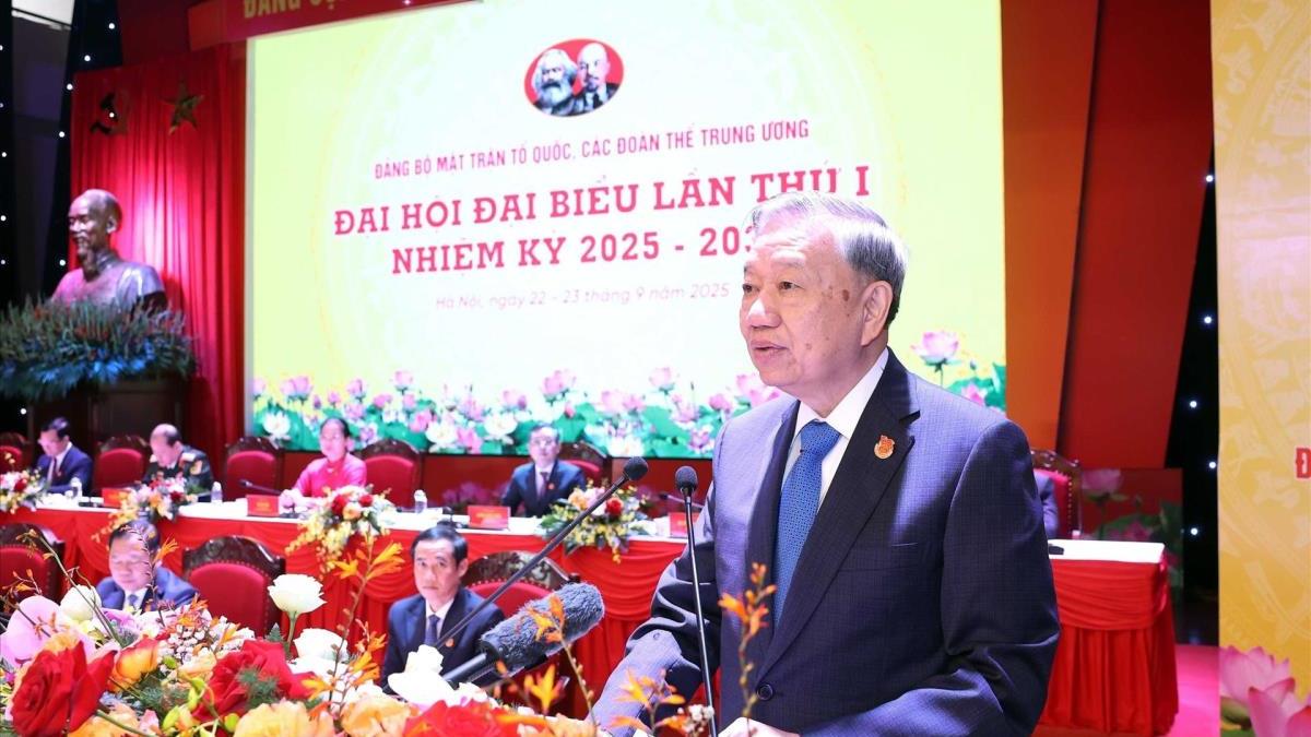 Ngày 23/9/2025, tại Hà Nội, Đại hội đại biểu Đảng bộ Mặt trận Tổ quốc, các đoàn thể Trung ương lần thứ I, nhiệm kỳ 2025-2030 diễn ra trọng thể, với sự tham dự của 346 đại biểu đại diện cho hơn 5.000 đảng viên của Đảng bộ Mặt trận Tổ quốc, các đoàn thể Trung ương. Tổng Bí thư Tô Lâm dự và phát biểu chỉ đạo Đại hội.