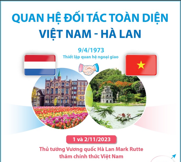 Nhận lời mời của Thủ tướng Chính phủ Phạm Minh Chính, Thủ tướng Vương quốc Hà Lan Mark Rutte thăm chính thức Việt Nam vào ngày 1 và 2/11/2023. Chuyến thăm có ý nghĩa quan trọng, diễn ra vào thời điểm hai nước có nhiều hoạt động kỷ niệm 50 năm ngày thiết lập quan hệ ngoại giao trong năm nay (9/4/1973-9/4/2023). Chuyến thăm góp phần đưa mối quan hệ Việt Nam-Hà Lan ngày càng thiết thực và đi vào chiều sâu, hiệu quả, nhất là trong các lĩnh vực chính trị, thương mại, đầu tư, ứng phó với biến đổi khí hậu, quản lý nước, nông nghiệp bền vững...