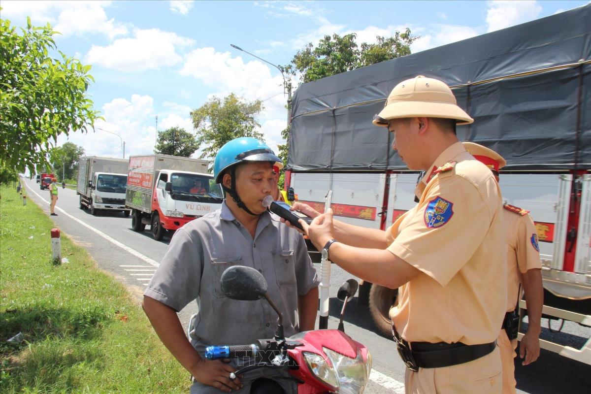 [Trong ảnh: Cảnh sát giao thông Công an tỉnh Hậu Giang thực hiện đo nồng độ cồn người tham gia giao thông. Ảnh: Nguyễn Hằng - TTXVN]
