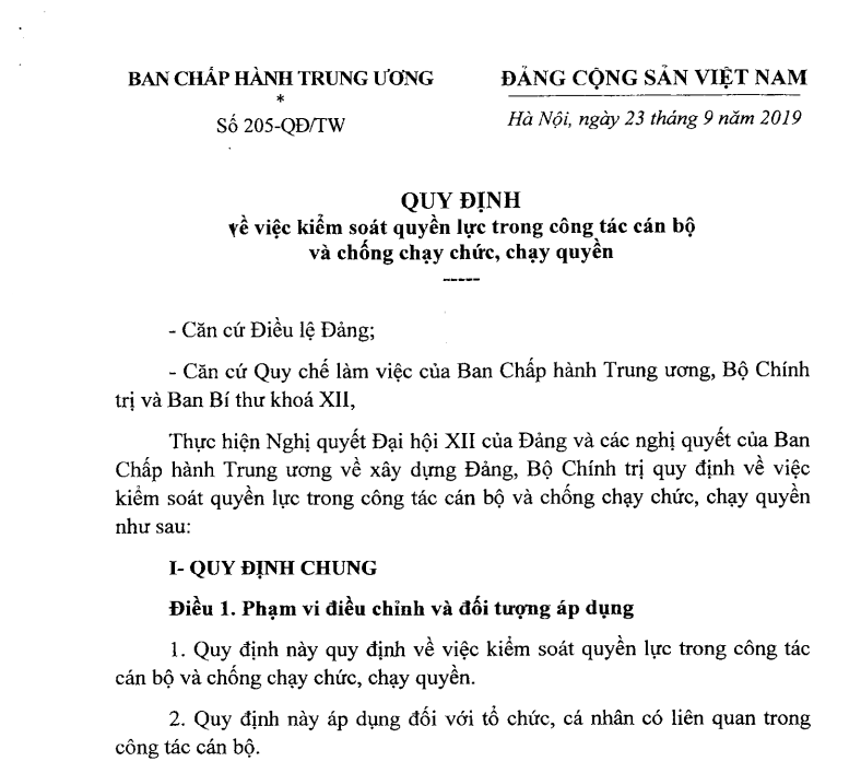Ngày 23/9/2019, Bộ Chính trị ban hành Quy định số 205-QĐ/TW quy định về kiểm soát quyền lực trong công tác cán bộ và chống chạy chức, chạy quyền. Quy định chỉ rõ các hành vi chạy chức, chạy quyền; các hành vi bao che, tiếp tay cho chạy chức, chạy quyền; trách nhiệm của tổ chức, cá nhân trong chống chạy chức chạy quyền và chế tài xử lý hành vi bao che tiếp tay cho chạy chức, chạy quyền. Việc thực thi Quy định 205 trong bối cảnh chuẩn bị, tiến hành đại hội đảng bộ các cấp, tiến tiến tới Đại hội XIII của Đảng góp phần lựa chọn cán bộ đủ phẩm chất, năng lực, uy tín ngang tầm nhiệm vụ vào bộ máy lãnh đạo trong nhiệm kỳ tới.