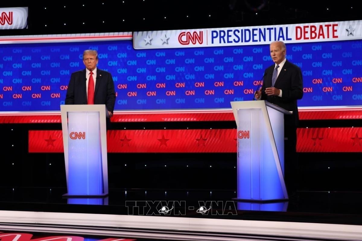 [Trong ảnh: Tổng thống Mỹ Joe Biden (phải) và cựu Tổng thống Donald Trump tại cuộc tranh luận trực tiếp đầu tiên ở Atlanta, bang Georgia, Mỹ, ngày 27/6/2024. Ảnh: CNN/TTXVN]