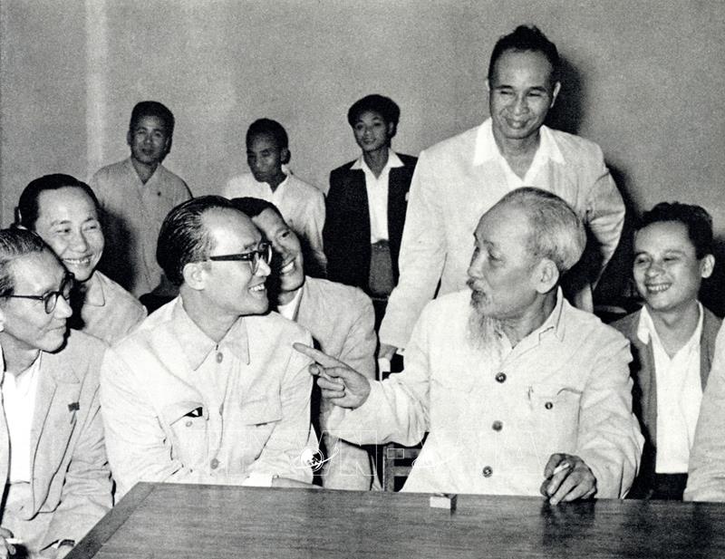 [Trong ảnh: Chủ tịch Hồ Chí Minh nói chuyện thân mật với các đại biểu trí thức dự Hội nghị chính trị đặc biệt (tháng 3-1964). Nguồn: TTXVN]