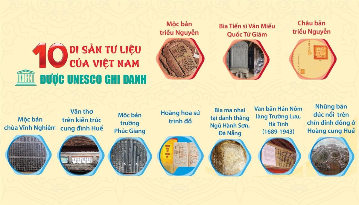 10 di sản tư liệu của Việt Nam được UNESCO ghi danh (tính đến 8/5/2024) gồm: Mộc bản triều Nguyễn (2009); Bia Tiến sĩ tại Văn Miếu - Quốc Tử Giám (2010, 2011); Mộc bản chùa Vĩnh Nghiêm (2012); Châu bản triều Nguyễn (2014, 2017); Thơ văn trên kiến trúc cung đình Huế (2016); Mộc bản Trường học Phúc Giang (2016); Hoàng hoa sứ trình đồ (2018); Bia ma nhai tại danh thắng Ngũ Hành Sơn, Đà Nẵng (2022); Văn bản Hán Nôm làng Trường Lưu, Hà Tĩnh (2022); Những bản đúc nổi trên chín đỉnh đồng ở Hoàng cung Huế (2024).
