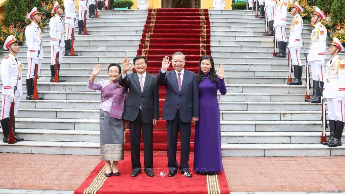 [Ảnh trên: Tổng Bí thư, Chủ tịch nước Tô Lâm và Phu nhân cùng Tổng Bí thư, Chủ tịch nước Lào Thongloun Sisoulith và Phu nhân tại Lễ đón. Ảnh: Trí Dũng - TTXVN]