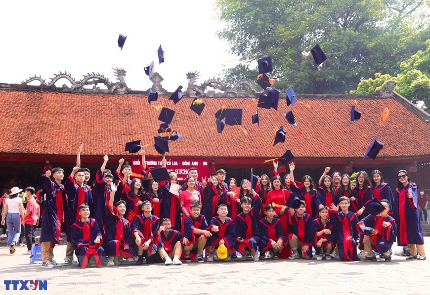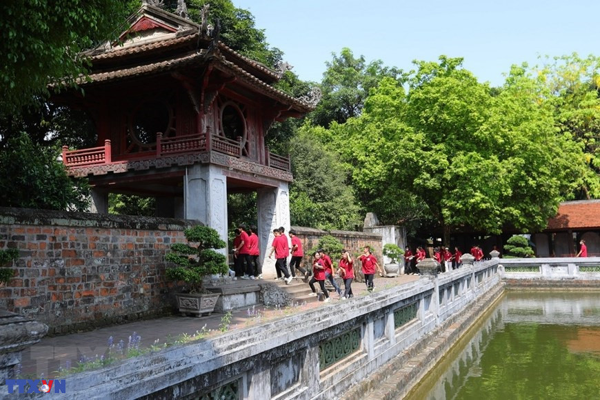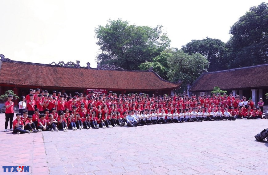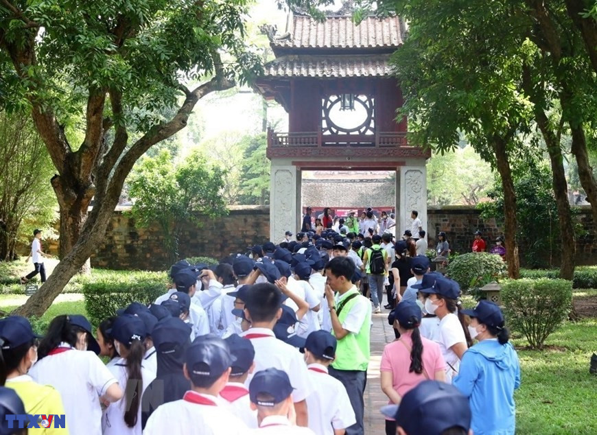 Khối lớp 9 Trường THCS Cổ Loa, Đông Anh, Hà Nội, đến Khu Di tích Quốc gia Đặc biệt Văn Miếu-Quốc Tử Giám. (Ảnh: Hoàng Hiếu/TTXVN)
