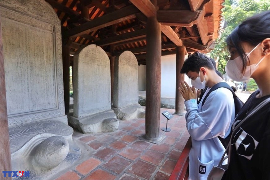 Càng gần đến ngày diễn ra Kỳ thi tuyển sinh lớp 10 THPT, lượng sỹ tử đến Khu Di tích Quốc gia Đặc biệt Văn Miếu-Quốc Tử Giám tăng đột biến. (Ảnh: Hoàng Hiếu/TTXVN)