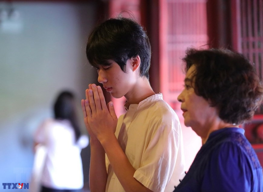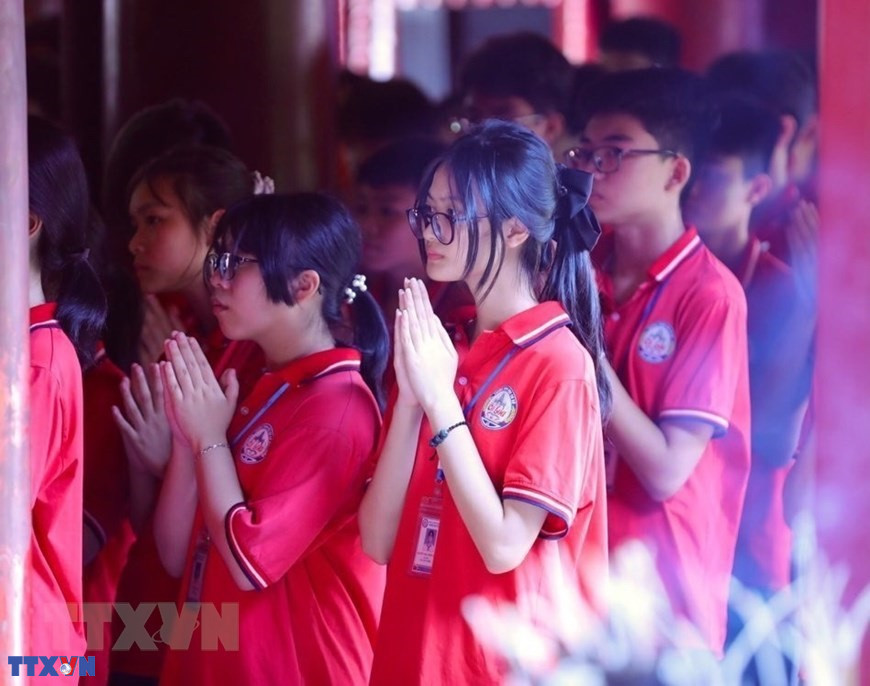 Học sinh Khối lớp 9 Trường THCS Cổ Loa, Đông Anh, Hà Nội, khấn cầu tại Khu Di tích Quốc gia Đặc biệt Văn Miếu-Quốc Tử Giám. (Ảnh: Hoàng Hiếu/TTXVN)