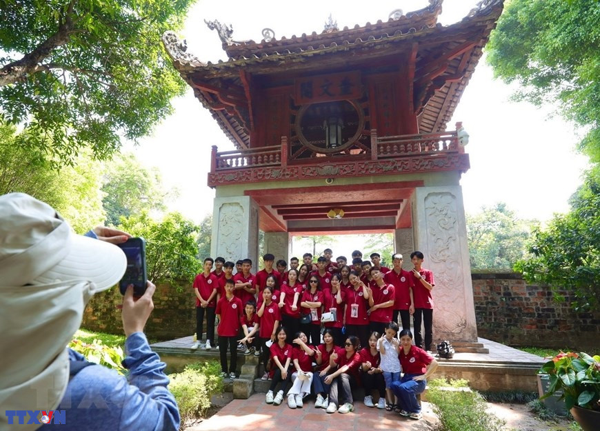 Học sinh khối 12 Trường THPT Lê Văn Thiêm-Hà Nội chọn Khu Di tích Quốc gia Đặc biệt Văn Miếu-Quốc Tử Giám là điểm đến trước Kỳ thi Đại học. (Ảnh: Hoàng Hiếu/TTXVN)