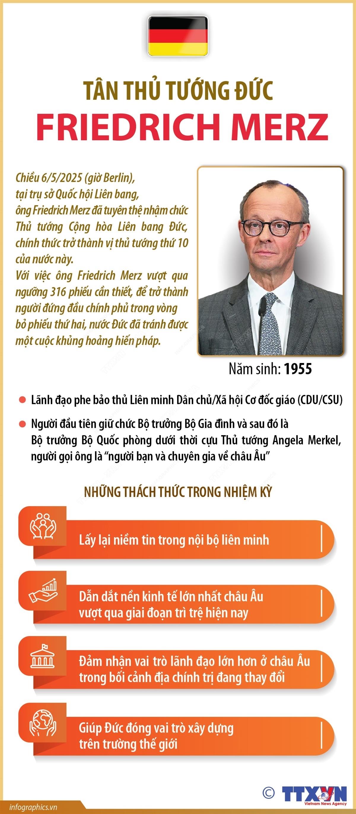 Chiều 6/5/2025 (giờ Berlin), tại trụ sở Quốc hội Liên bang, ông Friedrich Merz đã tuyên thệ nhậm chức Thủ tướng Cộng hòa Liên bang Đức, chính thức trở thành vị thủ tướng thứ 10 của nước này. Với việc ông Friedrich Merz vượt qua ngưỡng 316 phiếu cần thiết, để trở thành người đứng đầu chính phủ trong vòng bỏ phiếu thứ hai, nước Đức đã tránh được một cuộc khủng hoảng hiến pháp.
