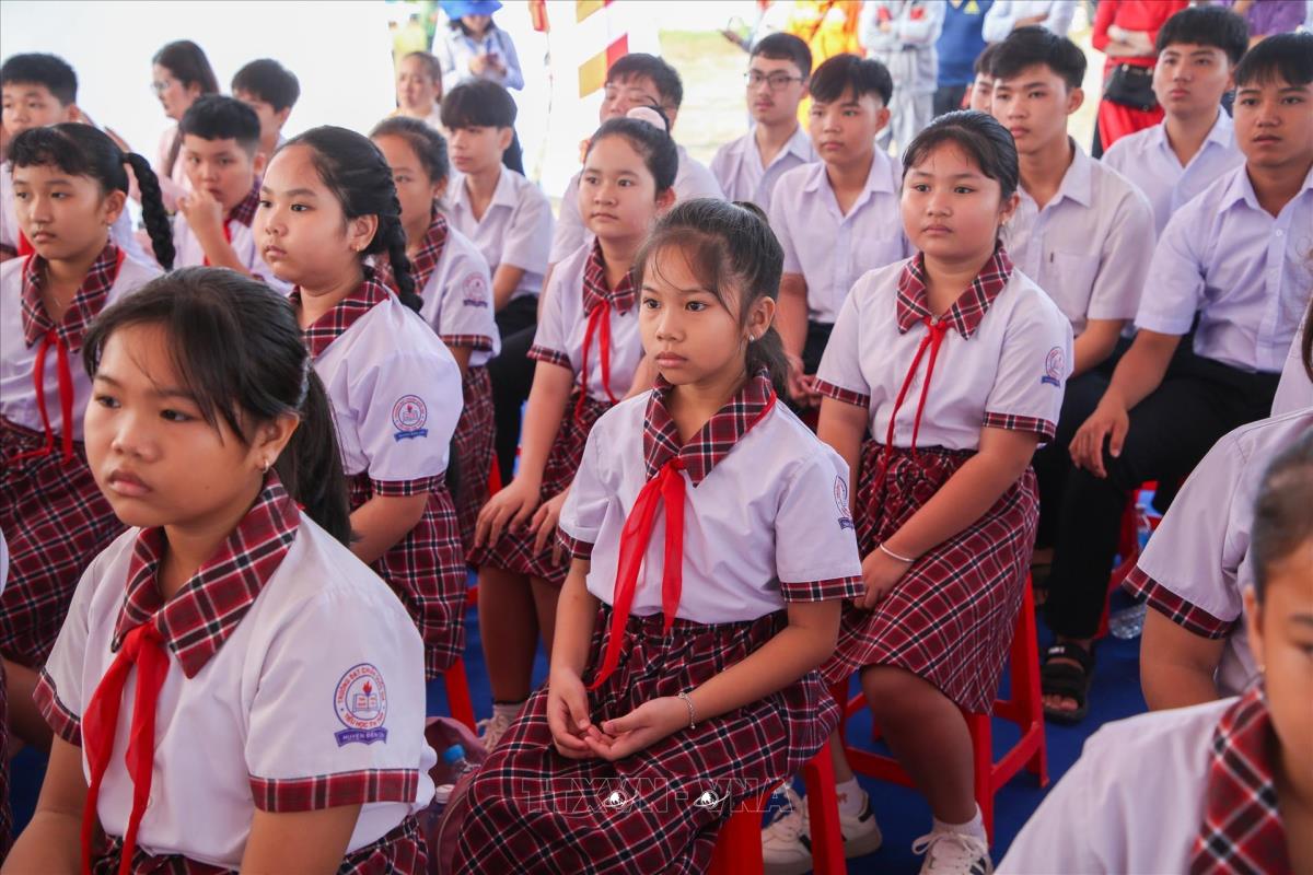 Cô và trò Trường Tiểu học Bến Cầu, xã Bến Cầu, tỉnh Tây Ninh trước giờ khởi công Trường phổ thông nội trú liên cấp Tiểu học và Trung học cơ sở Bến Cầu ở xã Bến Cầu (19/3/2026). Ảnh: Giang Phương – TTXVN