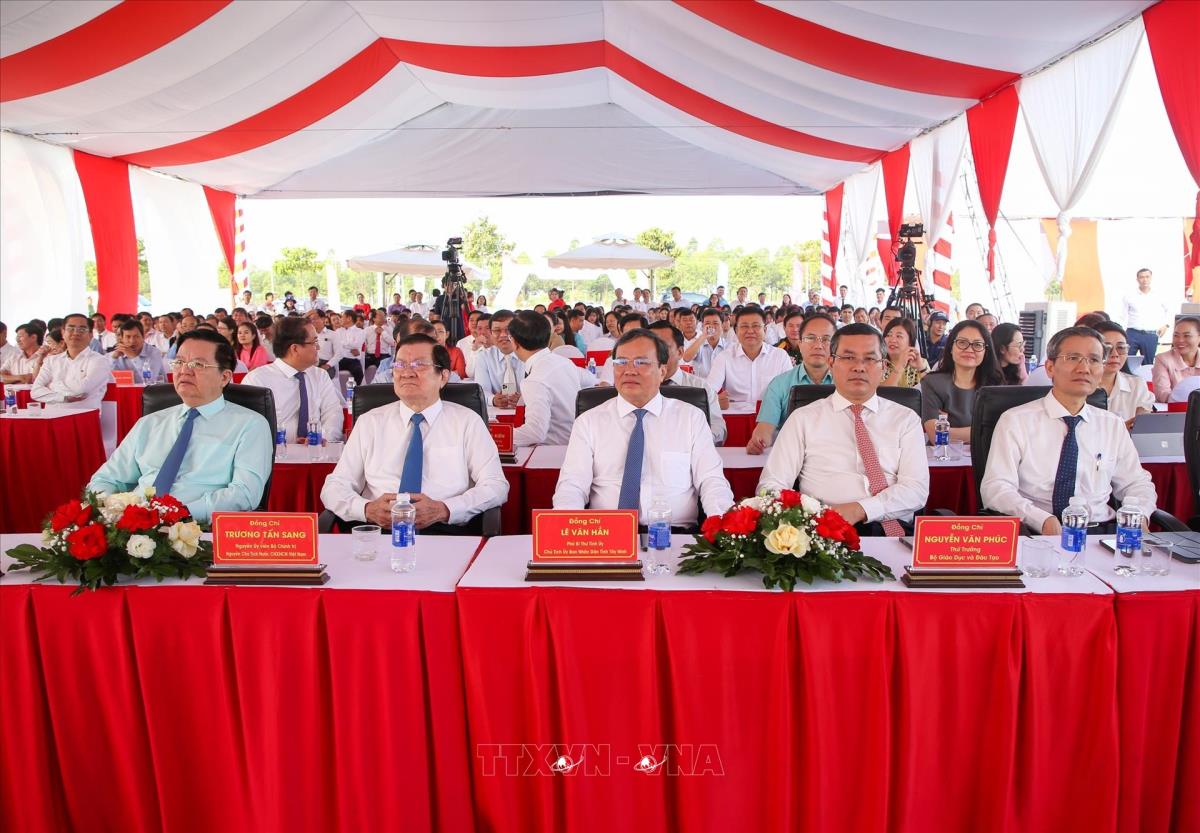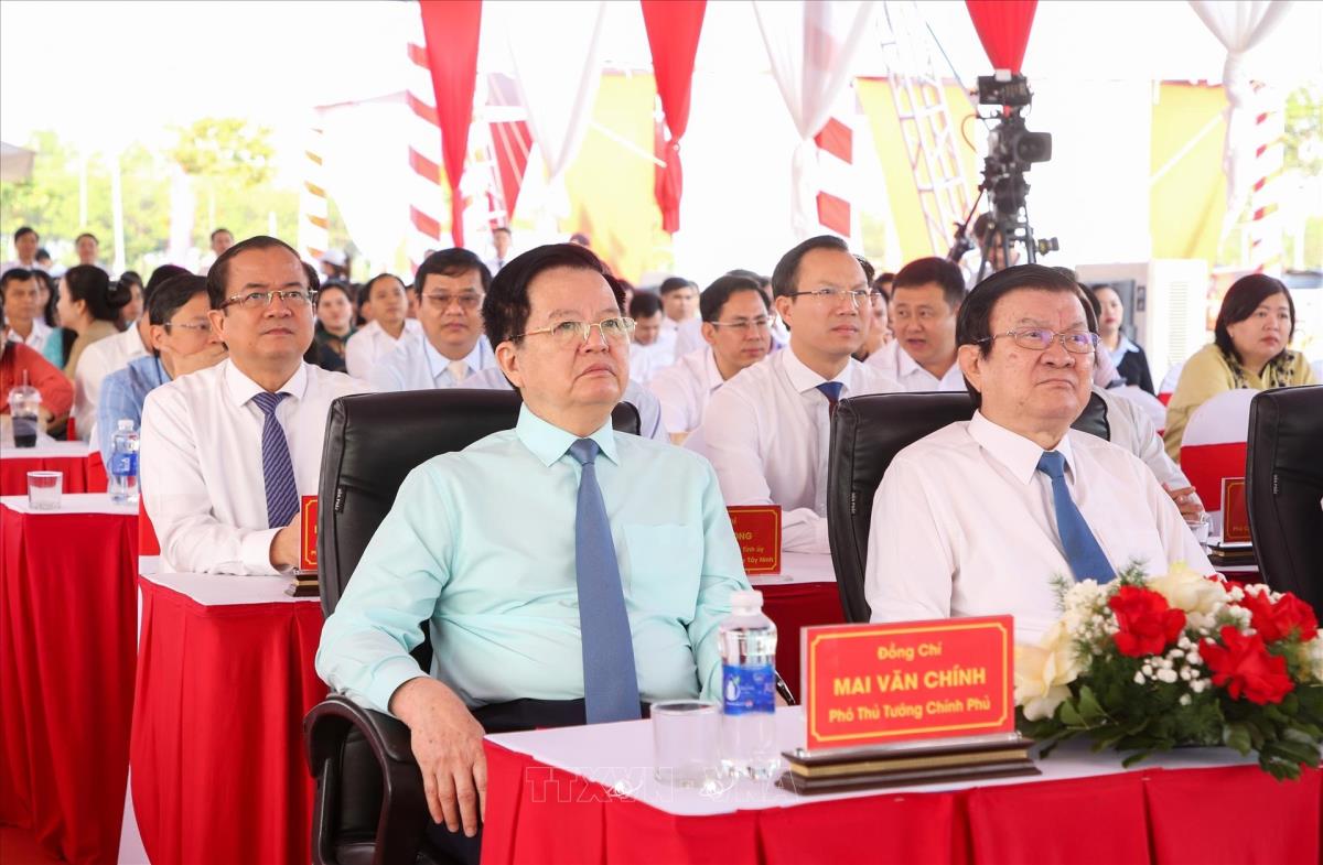 Phó Thủ tướng Chính phủ Mai Văn Chính (trái) và nguyên Ủy viên Bộ Chính trị, nguyên Chủ tịch nước Trương Tấn Sang (phải) dự Lễ khởi công, động thổ Trường phổ thông nội trú liên cấp Tiểu học và Trung học cơ sở Bến Cầu ở xã Bến Cầu, tỉnh Tây Ninh (19/3/2026). Ảnh: Giang Phương – TTXVN
