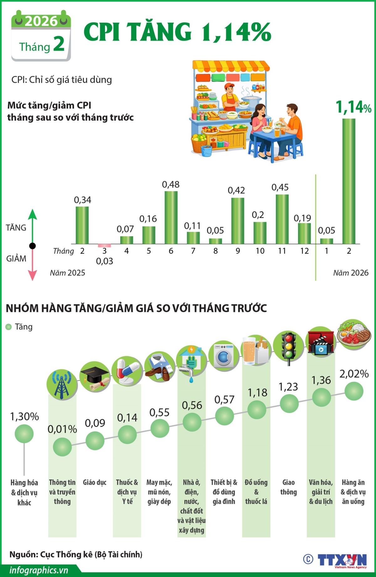 Hà Nội (TTXVN 6/3/2026) Chỉ số giá tiêu dùng (CPI) tháng 2/2026 tăng 1,14% so với tháng trước. Nguyên nhân chính là do giá thực phẩm, ăn uống ngoài gia đình và dịch vụ giao thông tăng do nhu cầu mua sắm, đi lại của người dân tăng trong dịp Tết Nguyên đán Bính Ngọ. Trong mức tăng 1,14% của CPI tháng 2/2026 so với tháng trước các nhóm hàng hóa và dịch vụ tiêu dùng chính đều tăng giá.