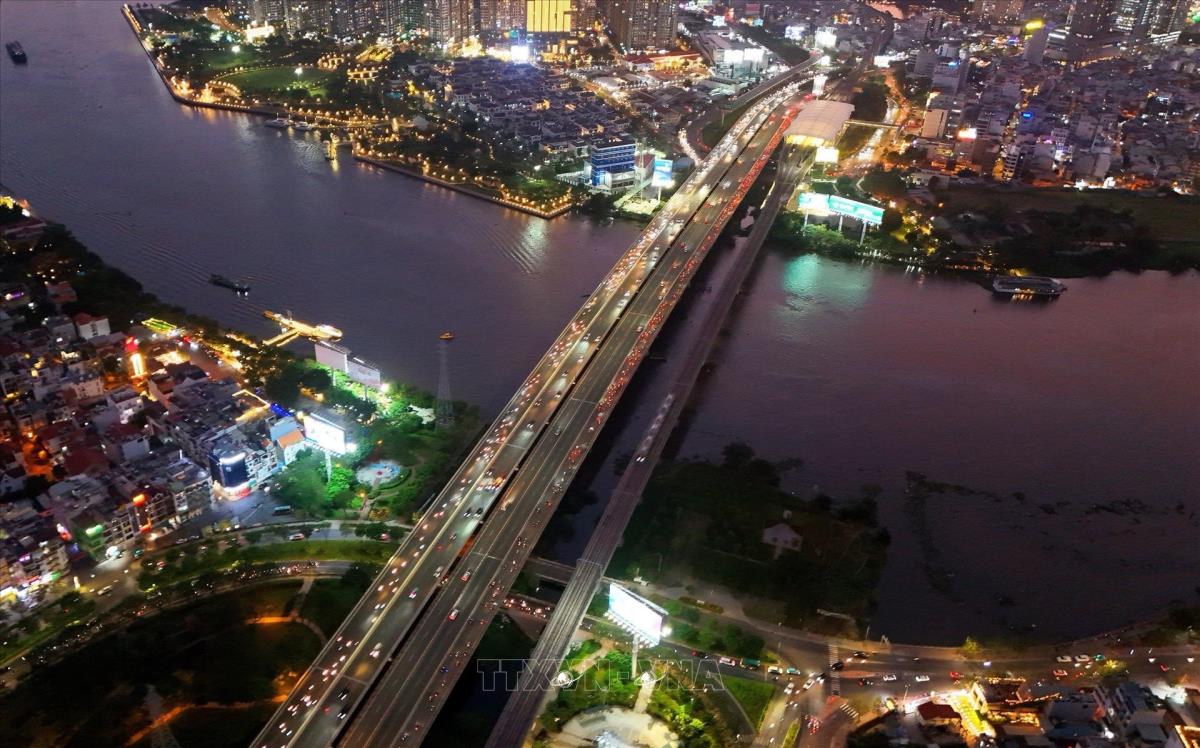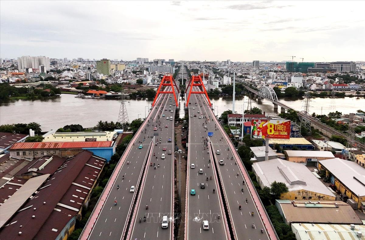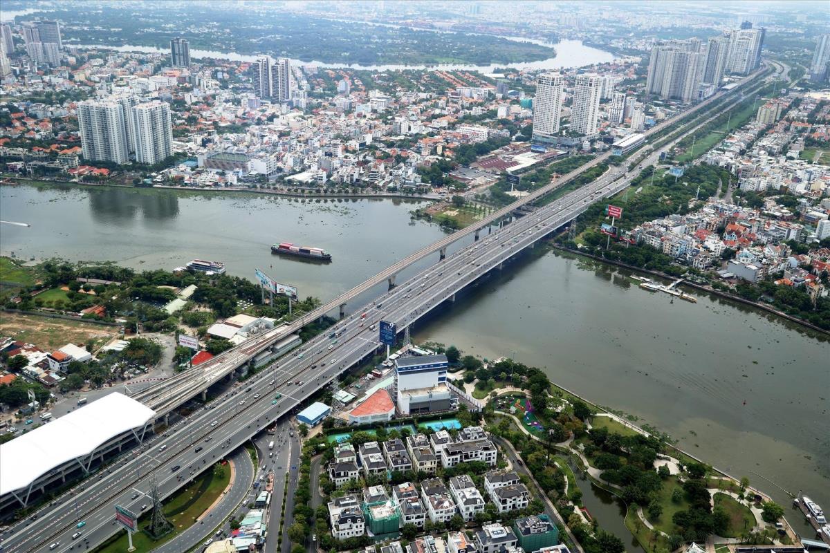 Cầu Sài Gòn 2 song song với cầu Sài Gòn 1 và đường sắt Metro số 1 bắt qua sông Sài Gòn kết nối trung tâm Thành phố Hồ Chí Minh với các đô thị vệ tinh phía Đông. Ảnh: Hồng Đạt - TTXVN