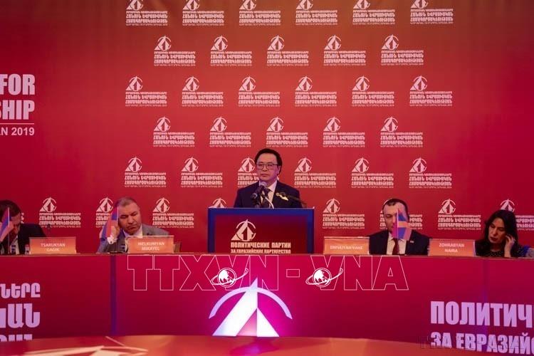 Trưởng Ban Đối ngoại Trung ương Hoàng Bình Quân phát biểu tại Hội thảo quốc tế với chủ đề “Các chính đảng vì hợp tác Á-Âu”, theo lời mời của Đảng “Armenia Thịnh vượng”, Cộng hòa Armenia (Yerevan, 2019). Ảnh: Dương Trí-TTXVN