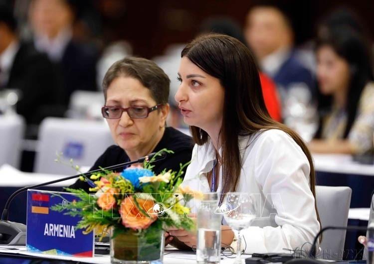 Đại biểu đại diện nước Cộng hòa Armenia phát biểu tại phiên thảo luận Chuyên đề 3 "Thúc đẩy tôn trọng đa dạng văn hoá vì sự phát triển bền vững" trong khuôn khổ chương trình Hội nghị Nghị sĩ trẻ toàn cầu lần thứ 9 được tổ chức tại Hà Nội, sáng 16/9/2023. Ảnh: TTXVN
