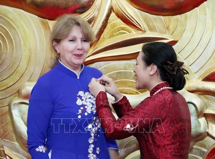 Liên hiệp các tổ chức hữu nghị Việt Nam tổ chức Lễ trao tặng Kỷ niệm chương “Vì hòa bình, hữu nghị giữa các dân tộc”, phần thưởng cao quý nhất của Liên hiệp cho bà Raisa Vardanyan, Đại sứ đặc mệnh toàn quyền Cộng hòa Armenia tại Việt Nam (5/4/2019). Ảnh: Văn Điệp - TTXVN