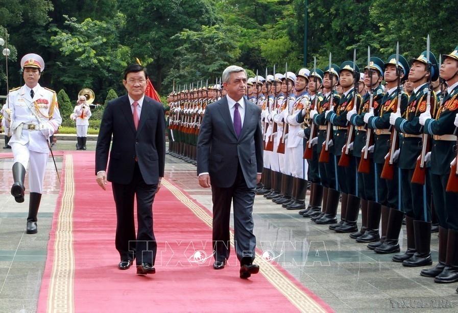 Chủ tịch nước Trương Tấn Sang chủ trì lễ đón Tổng thống Armenia thăm chính thức Việt Nam (8/6/2012). Ảnh Nguyễn Khang - TTXVN