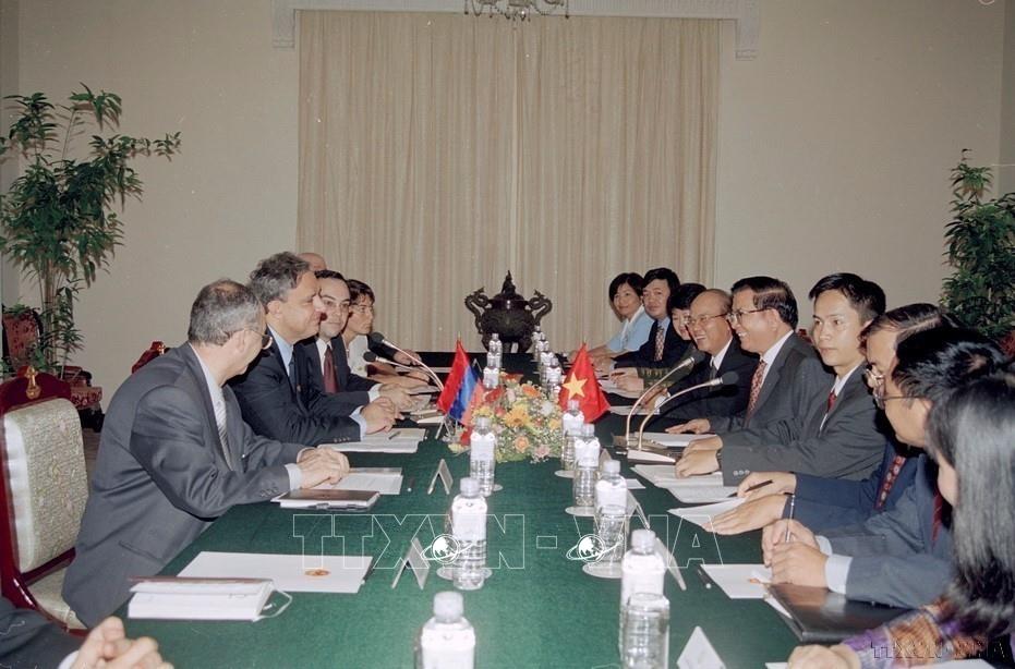Bộ trưởng Ngoại giao Nguyễn Duy Niên hội đàm với Bộ trưởng Ngoại giao Armenia V.O Skanian (Hà Nội, 7/8/2002). Ảnh Nguyễn Khang - TTXVN