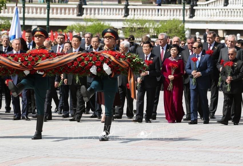 Chủ tịch nước Trương Tấn Sang và Phu nhân dự Lễ đặt vòng hoa tại đài tưởng niệm các chiến sĩ vô danh tại khu Quảng trường đỏ nhân kỷ niệm 70 năm Chiến thắng trong Chiến tranh Vệ quốc vĩ đại (Nga, 9/5/2015). Ảnh: Nguyễn Khang – TTXVN
