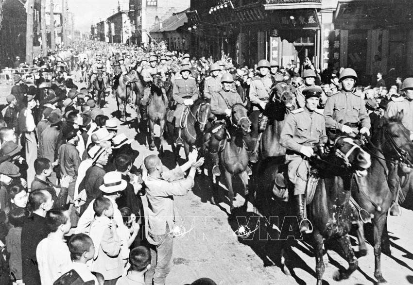 Người dân Cáp Nhĩ Tân (Trung Quốc) chào đón các chiến sĩ Hồng quân Liên Xô vào giải phóng thành phố. Ảnh: Tư liệu quốc tế/TTXVN