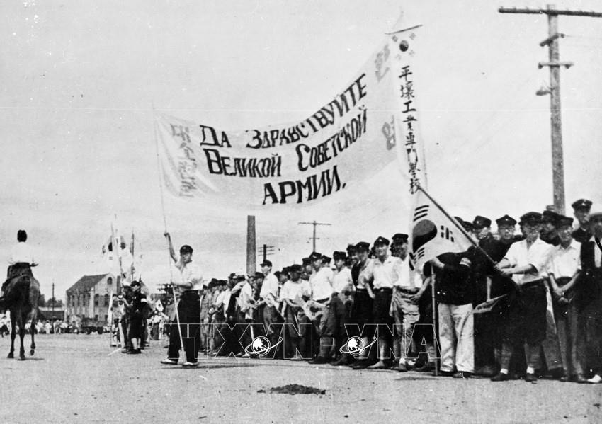 Đêm 9/8/1945, Hồng quân Liên Xô mở màn chiến dịch tấn công đội quân Quan Đông của Nhật tại Mãn Châu (Trung Quốc), tiêu diệt 1 triệu tên, giải phóng Đông Bắc Trung Quốc và Bắc Triều Tiên, đập tan căn cứ kinh tế quân sự - bàn đạp chiến tranh của Nhật trên lục địa, góp phần kết thúc Chiến tranh thế giới thứ hai ở khu vực châu Á - Thái Bình Dương. Trong ảnh: Nhân dân Bắc Triều Tiên chào đón các các chiến sĩ Hồng quân Liên Xô. Ảnh: Tư liệu quốc tế/TTXVN