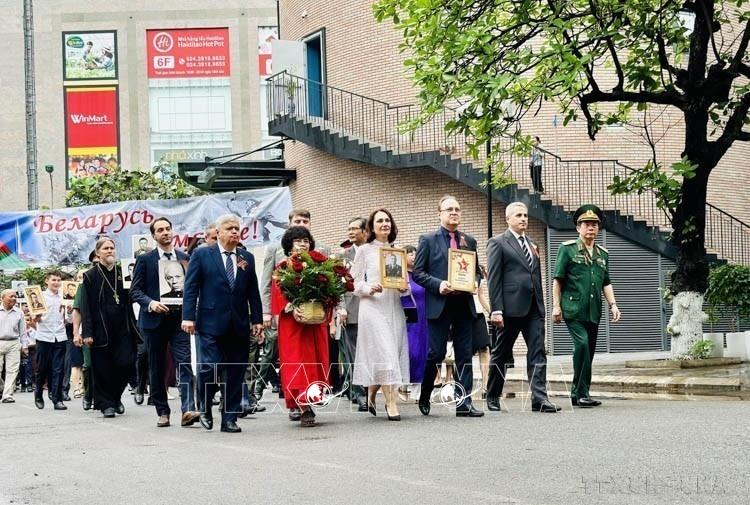 Các đại biểu tham gia hoạt động diễu hành “Binh đoàn bất tử”, tưởng nhớ người đã thiệt mạng trong Chiến tranh Vệ quốc vĩ đại do Đại sứ quán Liên bang Nga tại Việt Nam và Trung tâm Khoa học - Văn hóa Nga tại Hà Nội phối hợp tổ chức (3/5/2024). Ảnh: Việt Đức - TTXVN