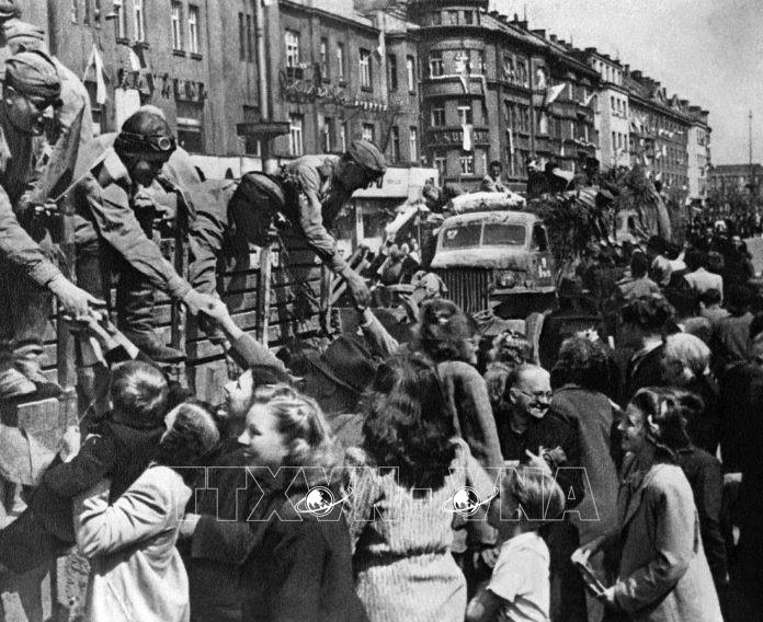 Người dân Praha chào đón những người lính Hồng quân trong ngày giải phóng. Ảnh: Tư liệu quốc tế/TTXVN phát