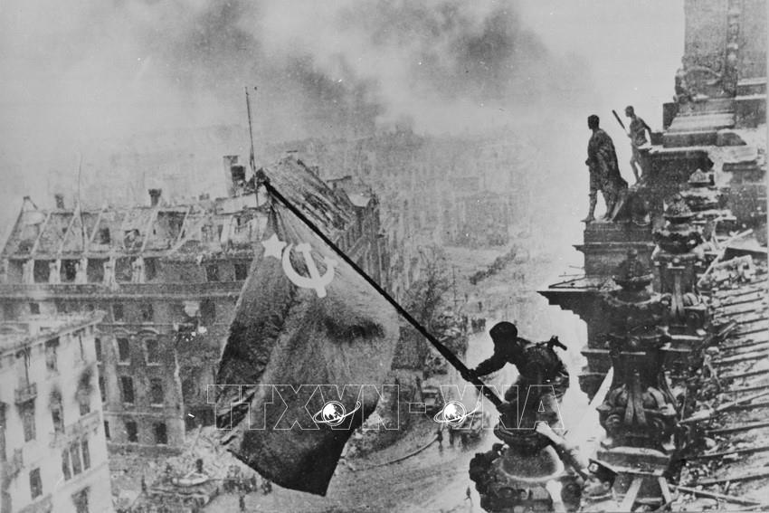 Ngày 16/4/1945, Hồng quân Liên Xô mở trận tấn công vào Berlin, sào huyệt cuối cùng của phát xít Đức và đến chiều 30/4/1945 đã chiếm được Nhà Quốc hội Đức, cắm lá cờ chiến thắng lên nóc tòa nhà này. Ảnh: Tư liệu Quốc tế/TTXVN