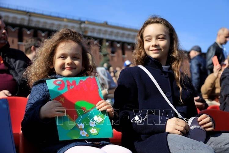 Thiếu nhi Nga mang theo bức tranh về ngày Chiến thắng tại Lễ duyệt binh kỷ niệm 77 năm Chiến thắng phát xít (1945 - 2022), trên quảng trường Đỏ (Nga, 9/5/2022). Ảnh: Trần Hiếu - TTXVN