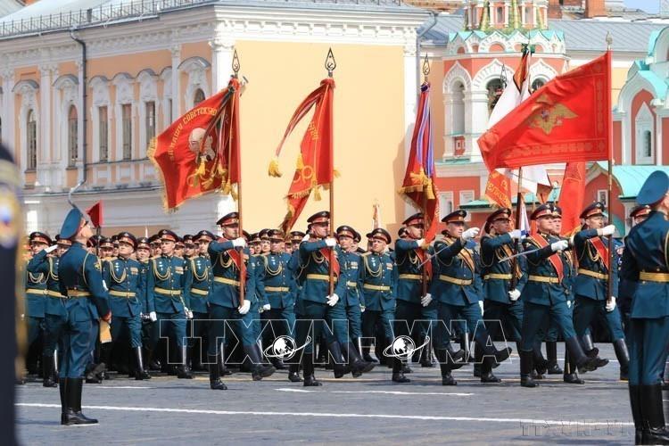 Khối quân nhân diễu binh qua lễ đài trong Lễ duyệt binh kỷ niệm 77 năm Chiến thắng phát xít (1945 - 2022), tại Quảng trường Đỏ ở thủ đô Moskva (Nga, 9/5/2022). Ảnh: Trần Hiếu - TTXVN
