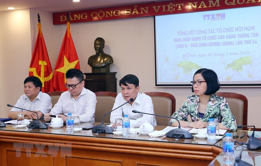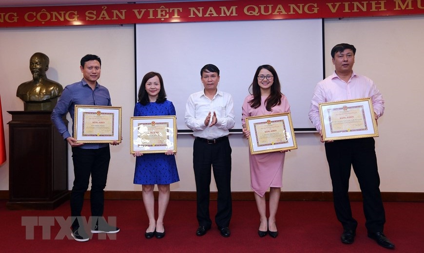 Đồng chí Nguyễn Đức Lợi, Ủy viên Trung ương Đảng, Tổng Giám đốc TTXVN trao tặng bằng khen cho các tập thể và cá nhân có thành tích trong tổ chức Hội nghị Ban Chấp hành Tổ chức các hãng Thông tấn châu Á-Thái Bình Dương (OANA) lần thứ 44. (Ảnh: Danh Lam/TTXVN)