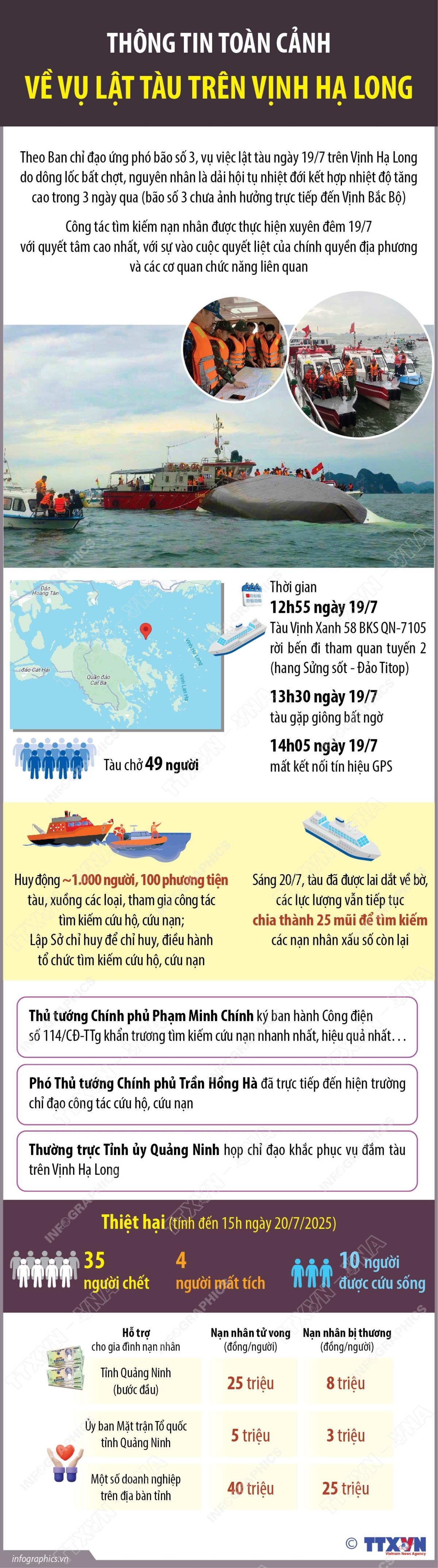 Hà Nội (TTXVN 20/7/2025) Chiều 20/7, tỉnh Quảng Ninh tổ chức hội nghị thông tin báo chí về vụ lật tàu trên Vịnh Hạ Long. Theo báo cáo của Ủy ban nhân dân tỉnh Quảng Ninh, đến 1 giờ 40 phút, ngày 20/7, các lực lượng chức năng trục vớt được tàu và tìm thấy 45 trên tổng số 49 người (trong đó 10 người sống và 35 người đã chết); 4 người mất tích chưa tìm thấy.