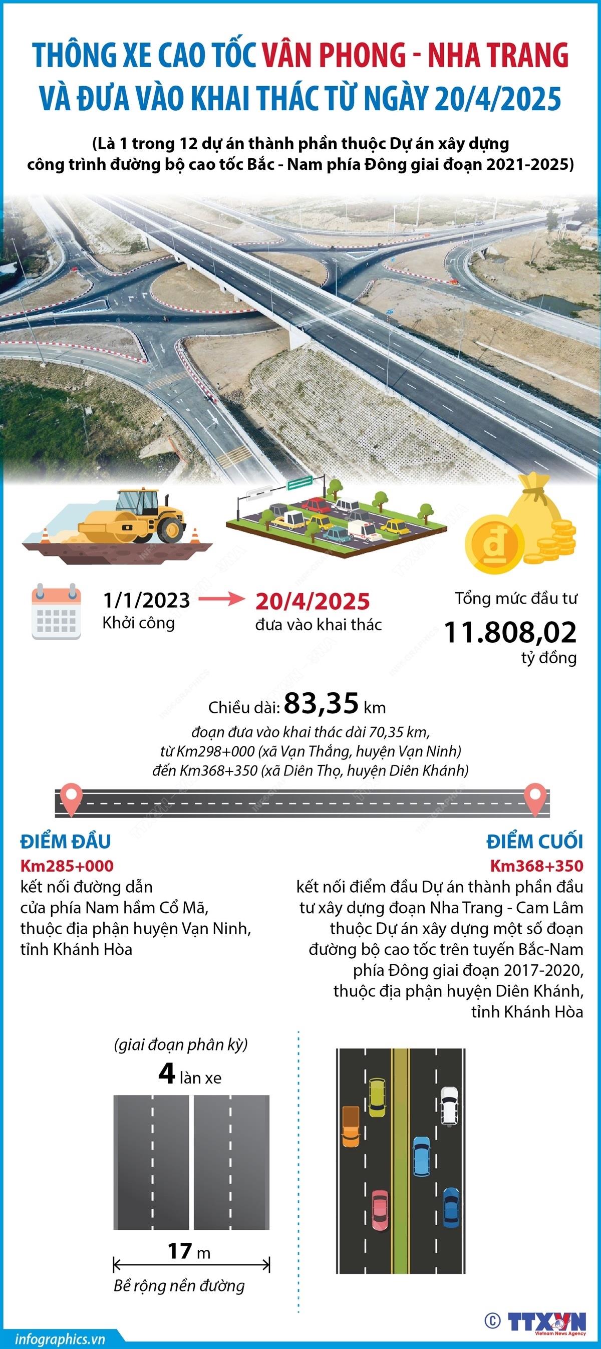 Sáng 19/4/2025, tại nút giao quốc lộ 26, thị xã Ninh Hòa, Bộ Xây dựng phối hợp với UBND tỉnh Khánh Hòa tổ chức Lễ khánh thành và đưa vào khai thác đoạn tuyến cao tốc Vân Phong - Nha Trang, thuộc dự án đường bộ cao tốc Bắc - Nam phía Đông giai đoạn 2021-2025. Dự án có tổng chiều dài 83,35 km, với đoạn đưa vào khai thác lần này dài 70,35 km, từ Km298+000 (xã Vạn Thắng, huyện Vạn Ninh) đến Km368+350 (xã Diên Thọ, huyện Diên Khánh), được thiết kế theo tiêu chuẩn đường cao tốc loại A, tốc độ tối đa 120 km/h. Giai đoạn phân kỳ khai thác với 4 làn xe, tốc độ thiết kế 80 km/h.