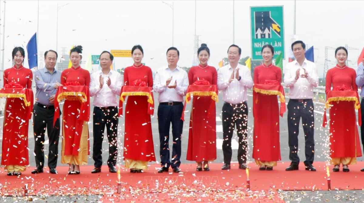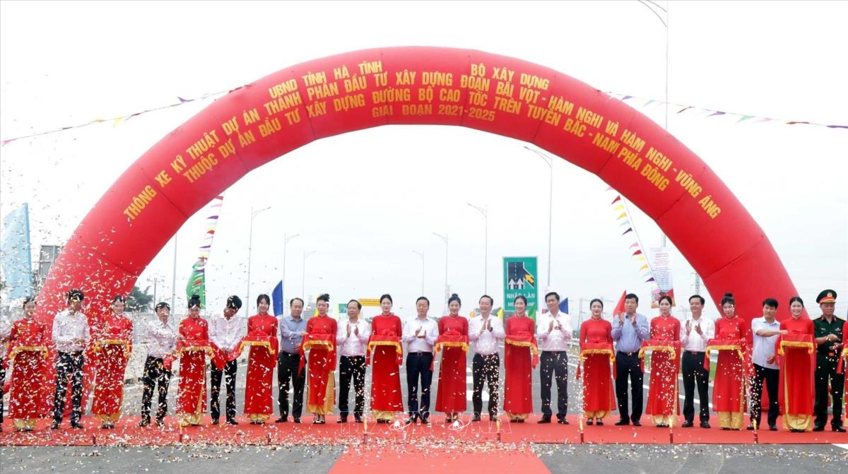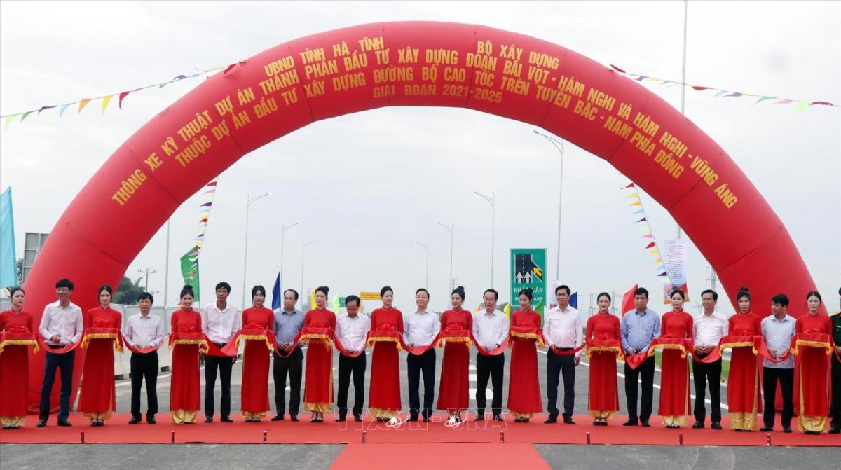 Phó Thủ tướng Trần Hồng Hà cùng các đại biểu thực hiện nghi thức cắt băng thông xe kỹ thuật 2 dự án thành phần cao tốc Bắc - Nam qua Hà Tĩnh. Ảnh: Công Tường-TTXVN