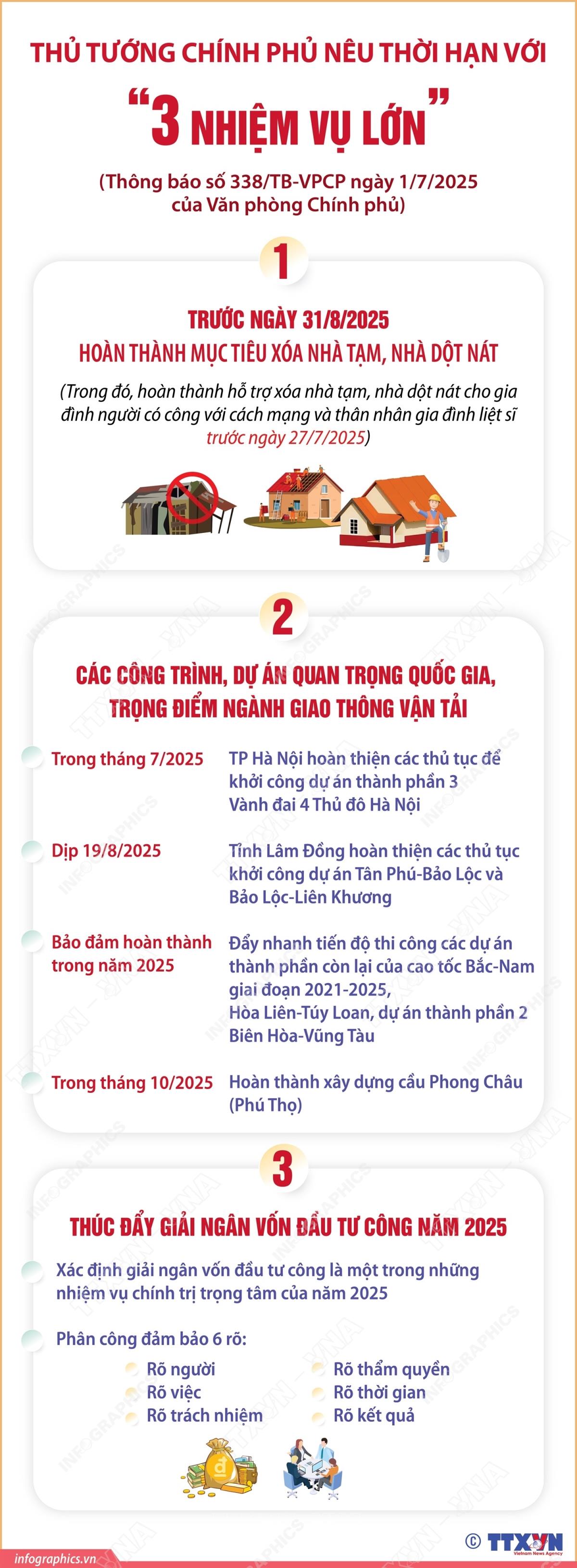 Thủ tướng Chính phủ chỉ đạo các bộ ngành, địa phương quyết tâm hoàn thành cơ bản mục tiêu xóa nhà tạm, nhà dột nát trên phạm vi cả nước trước ngày 31/8/2025; trong đó, hỗ trợ nhà ở cho thân nhân liệt sĩ, người có công với cách mạng, hoàn thành trước ngày 27/7/2025. TP Hà Nội, tỉnh Lâm Đồng hoàn thiện các thủ tục để khởi công dự án thành phần 3 Vành đai 4 Thủ đô Hà Nội trong tháng 7/2025, dự án Tân Phú-Bảo Lộc và Bảo Lộc-Liên Khương dịp 19/8/2025; đẩy nhanh tiến độ thi công các dự án thành phần còn lại của cao tốc Bắc-Nam giai đoạn 2021-2025, Hòa Liên-Túy Loan, dự án thành phần 2 Biên Hòa-Vũng Tàu, bảo đảm hoàn thành trong năm 2025… Đối với nhiệm vụ giải ngân vốn đầu tư công, Thủ tướng nêu rõ đẩy nhanh tiến độ giải ngân vốn đầu tư công phải đi đôi với bảo đảm chất lượng, kỹ thuật, mỹ thuật công trình, an toàn vệ sinh lao động, không đội vốn, chống tham nhũng, tiêu cực, thất thoát, lãng phí; xác định giải ngân vốn đầu tư công là một trong những nhiệm vụ trọng tâm của năm 2025.