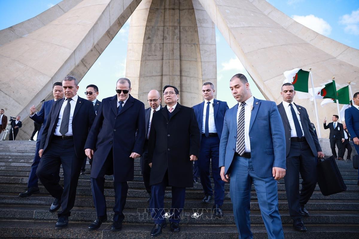 Thủ tướng Phạm Minh Chính đặt vòng hoa tại Đài tưởng niệm Liệt sĩ Algeria (19/11/2025). Ảnh: Dương Giang-TTXVN