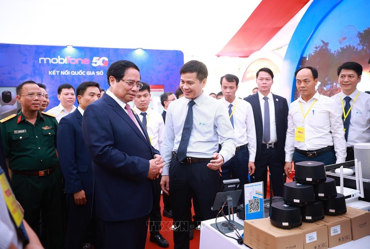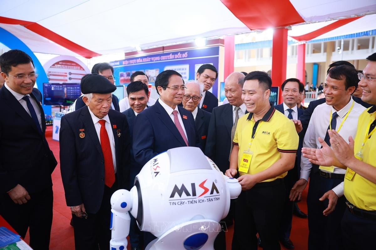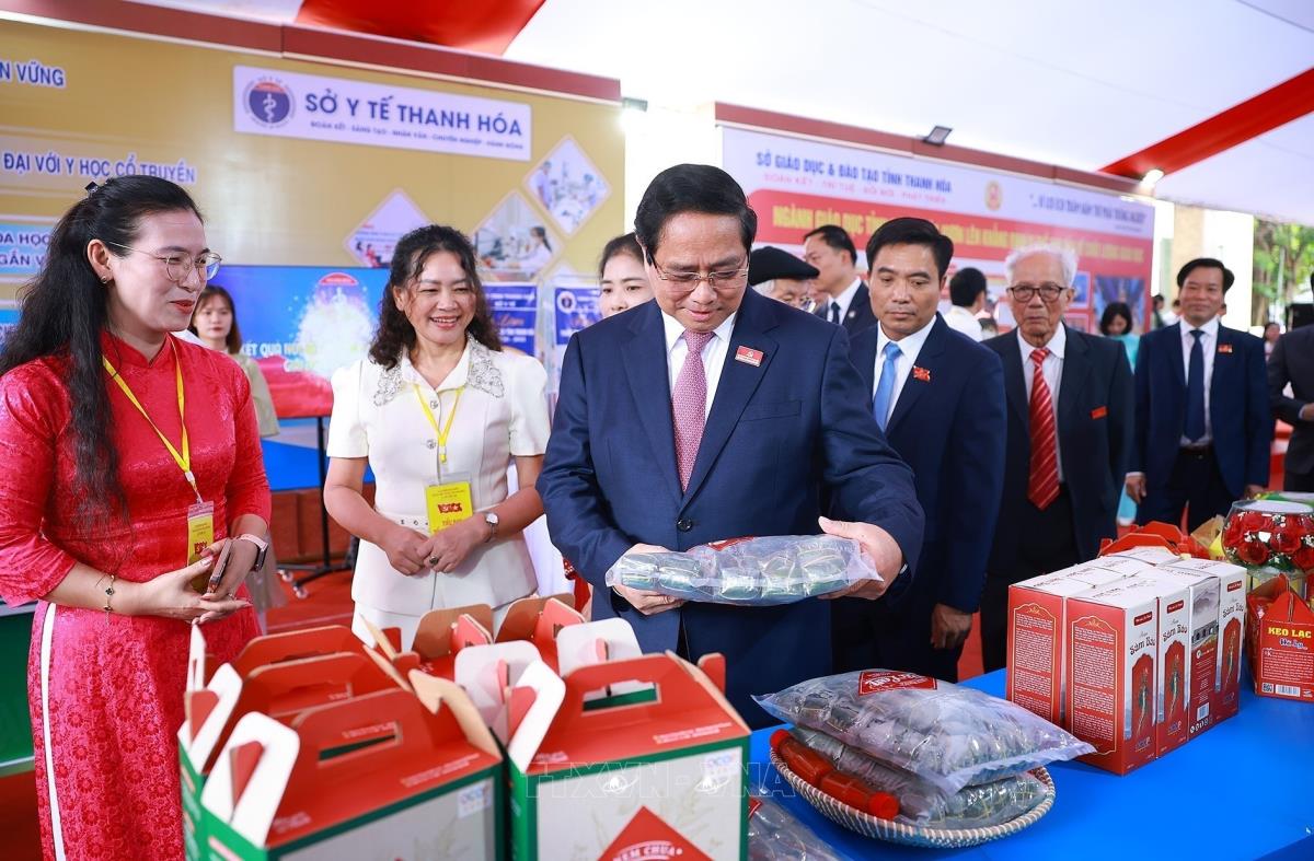 Thủ tướng Phạm Minh Chính tham quan triển lãm thành tựu kinh tế - xã hội của tỉnh Thanh Hoá bên lề đại hội (15/10/2025). Ảnh: Dương Giang-TTXVN