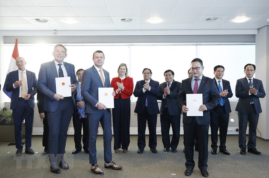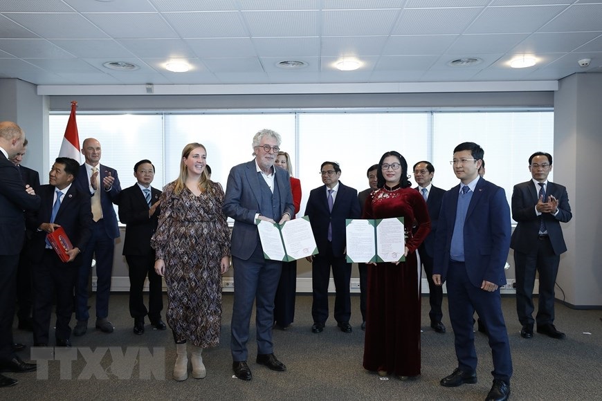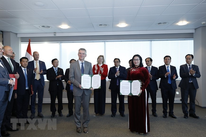 Thủ tướng Phạm Minh Chính và Bộ trưởng phụ trách Ngoại thương và Hợp tác phát triển Hà Lan Liesje Schreinemacher chứng kiến lễ trao bản ghi nhớ hợp tác giữa Viện Quyền con người, Học viện chính trị quốc gia Hồ Chí Minh và Viện Clingendael. (Ảnh: Dương Giang/TTXVN)