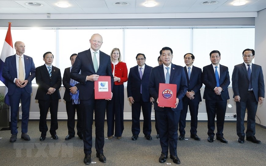 Thủ tướng Phạm Minh Chính chứng kiến lễ trao Biên bản ghi nhớ (MoU) về Quan hệ hợp tác và đối tác chiến lược toàn diện giữa Tập đoàn Hoàng gia De Heus và Tập đoàn Hùng Nhơn. (Ảnh: Dương Giang/TTXVN)