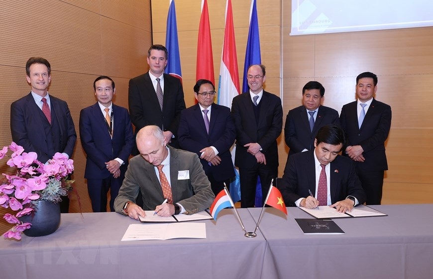 Thủ tướng Phạm Minh Chính chứng kiến lễ ký kết giữa Việt Nam và Luxembourg. (Ảnh: Dương Giang/TTXVN)