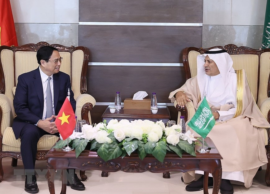 Chủ tịch Liên đoàn các Phòng Thương mại Saudi Arabia (FSC) Hassan Al Hwaizyi đón Thủ tướng Phạm Minh Chính đến dự Diễn đàn Kinh doanh Việt Nam-Saudi Arabia. (Ảnh: Dương Giang/TTXVN)