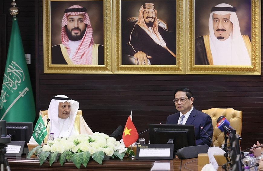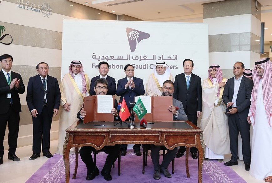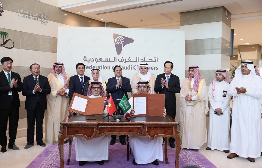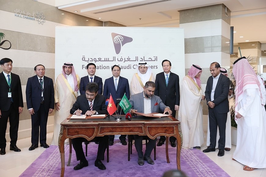 Thủ tướng Phạm Minh Chính chứng kiến Lễ ký Biên bản ghi nhớ giữa Liên đoàn Thương mại và Công nghiệp Việt Nam (VCCI) với Liên đoàn các Phòng Thương mại Saudi Arabia (FSC). (Ảnh: Dương Giang/TTXVN)