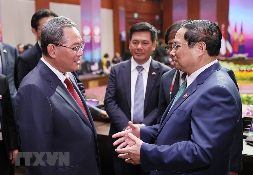 Thủ tướng Phạm Minh Chính gặp gỡ Thủ tướng Trung Quốc Lý Cường tại hội nghị. (Ảnh: Dương Giang/TTXVN)