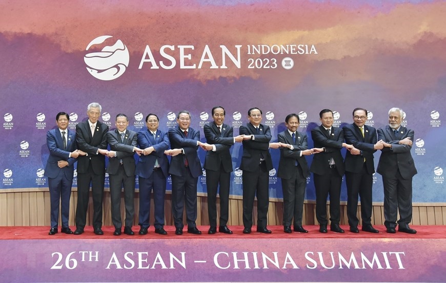 Thủ tướng Phạm Minh Chính và Trưởng đoàn các nước tham dự Hội nghị Cấp cao ASEAN-Trung Quốc lần thứ 26. (Ảnh: Dương Giang/TTXVN)