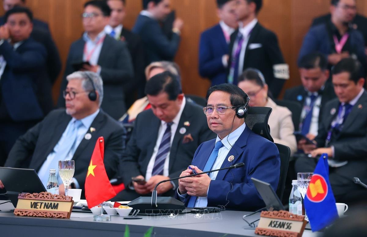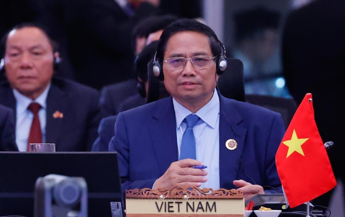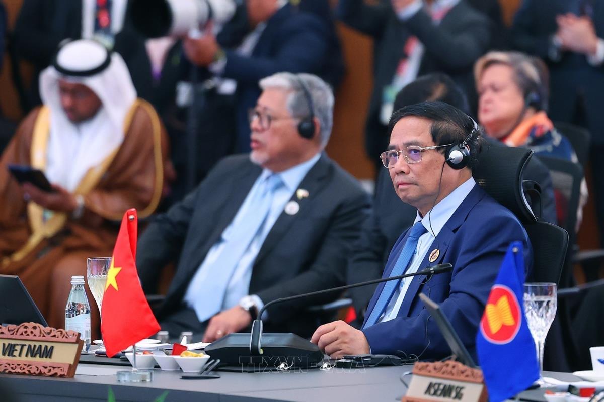 Thủ tướng Phạm Minh Chính dự và phát biểu tại Hội nghị Cấp cao Kinh tế ASEAN - Hội đồng Hợp tác Vùng Vịnh (GCC) - Trung Quốc (27/5/2025). Ảnh: Dương Giang-TTXVN