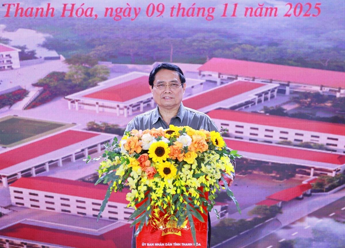 Thủ tướng Phạm Minh Chính phát biểu tại Lễ khởi công tại điểm Trường nội trú liên cấp Tiểu học và Trung học cơ sở xã Yên Khương, Thanh Hóa (9/11/2025). Ảnh: Dương Giang-TTXVN