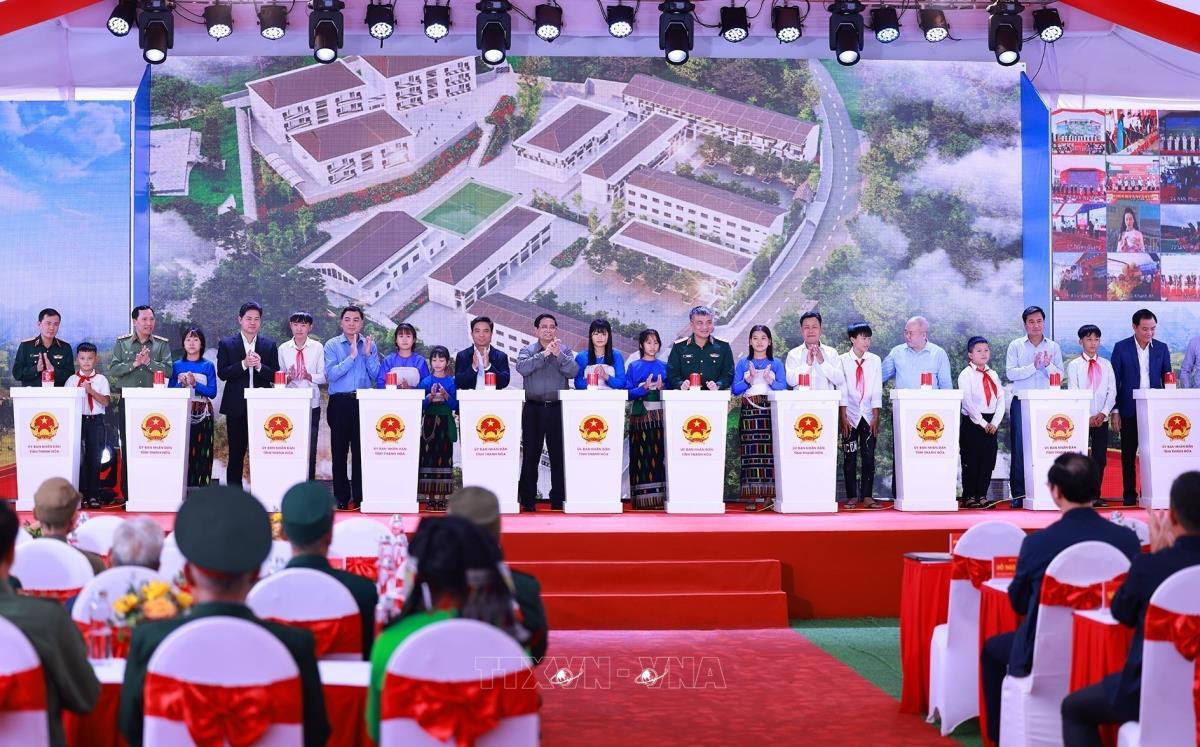 Thủ tướng Phạm Minh Chính và các đại biểu khởi công điểm Trường nội trú liên cấp Tiểu học và Trung học cơ sở xã Yên Khương, Thanh Hóa (9/11/2025). Ảnh: Dương Giang-TTXVN