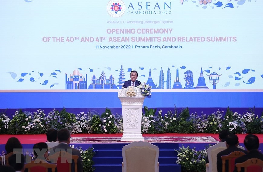 Thủ tướng Campuchia, Chủ tịch ASEAN 2022 Samdech Techo Hun Sen phát biểu khai mạc hội nghị. (Ảnh: Dương Giang/TTXVN)