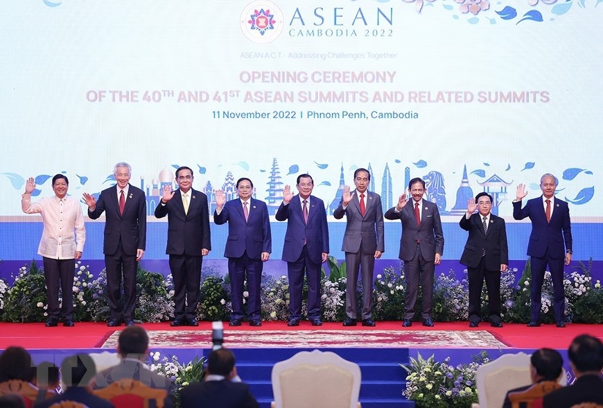 Thủ tướng Phạm Minh Chính và các trưởng đoàn tham dự Lễ khai mạc Hội nghị cấp cao ASEAN lần thứ 40 và 41. (Ảnh: Dương Giang/TTXVN)