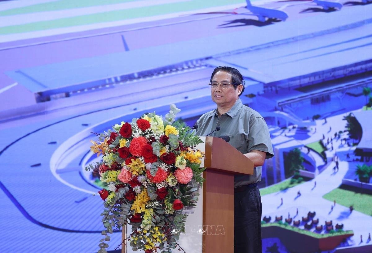 Thủ tướng Phạm Minh Chính phát biểu tại lễ khởi công, khánh thành dự án trọng điểm Quốc gia và các công trình lớn nhân kỷ niệm 50 năm Giải phóng miền Nam (19/4/2025). Ảnh: Dương Giang-TTXVN